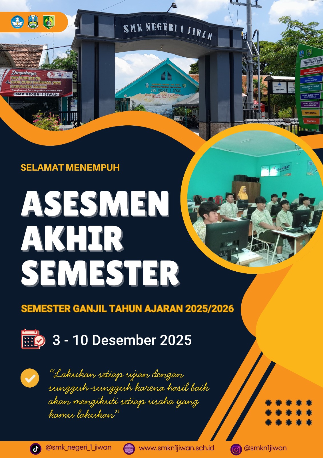 SMKN 1 Jiwan sukses menyelenggarakan kegiatan Asesmen Akhir Semester (AAS) yang dimulai pada hari Rabu, 3 Desember 2025. Kegiatan evaluasi akademik..
